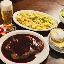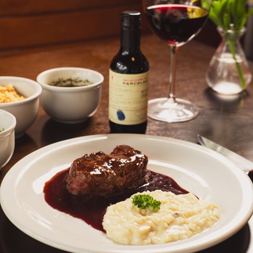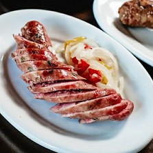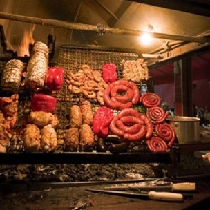 Enquanto aguarda uma mesa, o cliente do Parrilla Del Mercado pode tomar um chope no balcão e observar a grelhagem das carnes, que é feita em fogo de lenha por churrasqueiros Uruguaios. Só serve carnes Uruguaias e Argentinas, em porções generosas, bem temperadas. Vale a pena experimentar o Bife Parrillero, contra-filé coberto com molho à base de vinho e pimenta-do-reino. Para acompanhar, a batata assada com queijo de Roquefort.